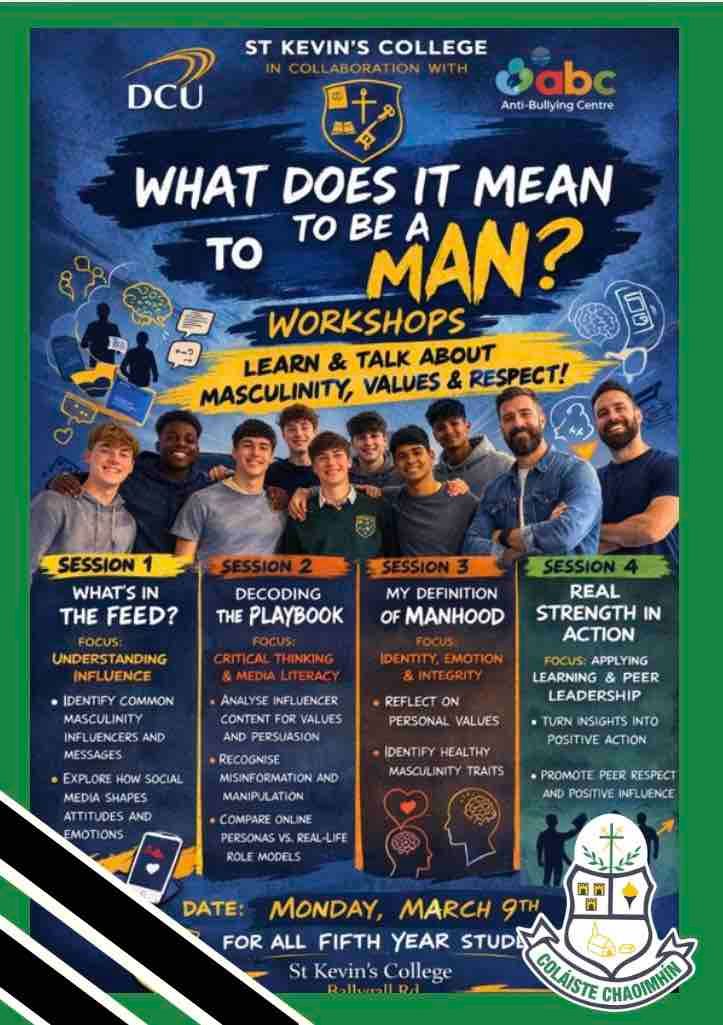 St Kevin’s College, in collaboration with Dublin City University (DCU) and the Anti-Bullying Centre (ABC), will be delivering a workshop on the 9th Nov for Fifth Year students entitled What Does It Mean to Be a Man?