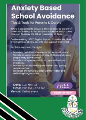 ISPCC is delighted to deliver a FREE online webinar to parent’s/ carers on ’Anxiety Based School Avoidance’ which takes place on Tuesday the 4th of November at...