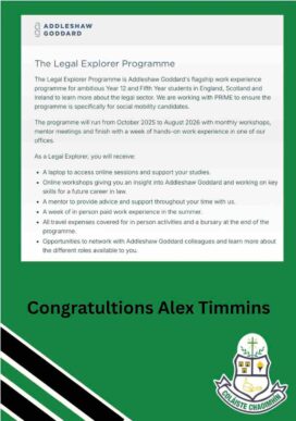 We’re thrilled to share that Alex has been selected for a highly coveted internship with the Legal Explorers Program at the prestigious law firm Addleshaw Goddard....