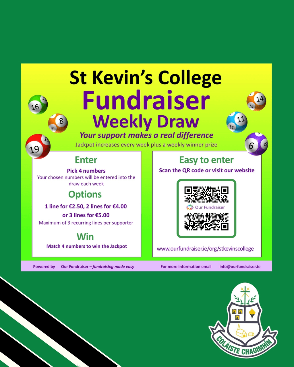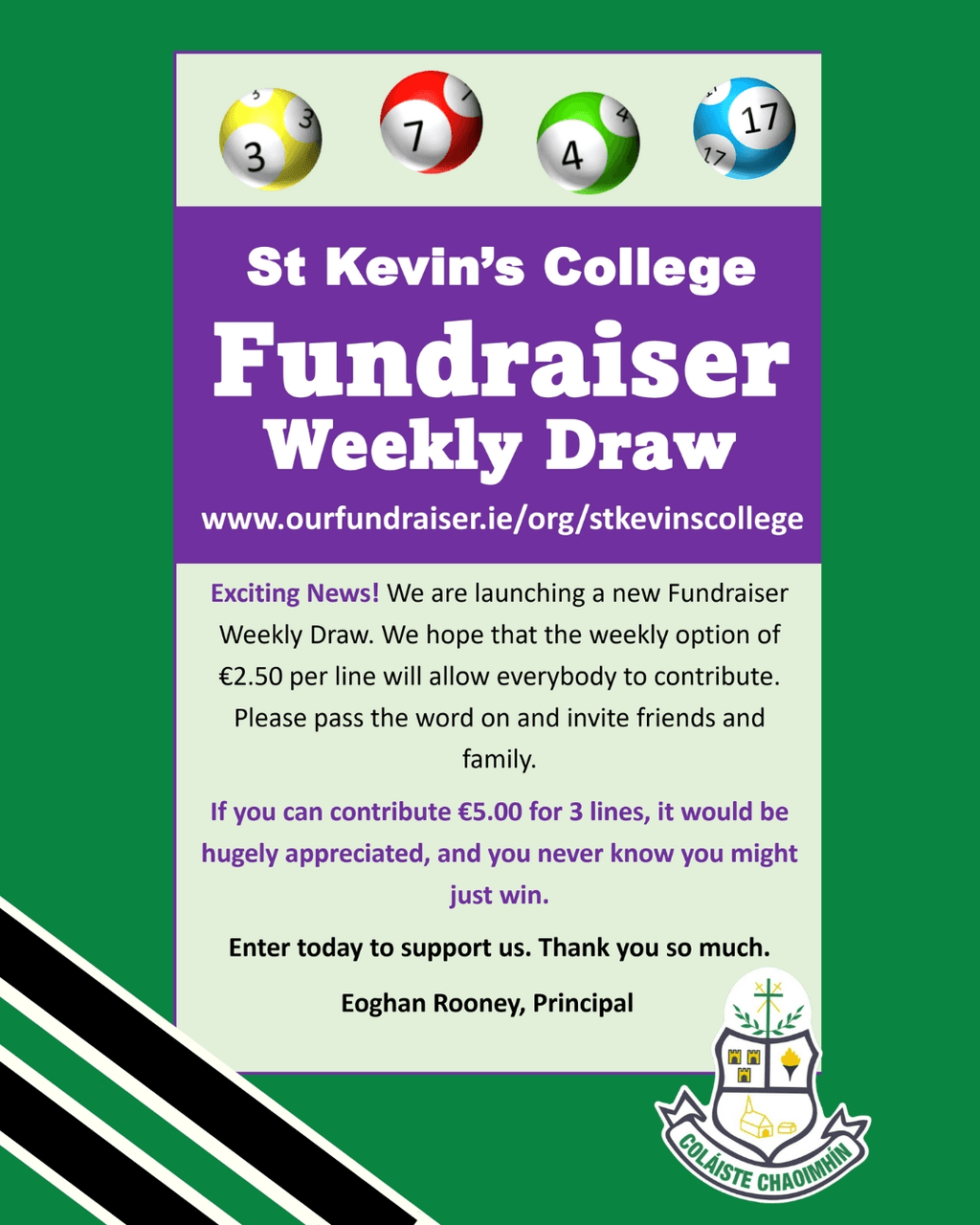 St Kevin’s College is delighted to launch our new Weekly Fundraiser Draw. For just €2.50 per line, you can take part and help support our school community. If you’re able to contribute €5.00 for three lines, it would be greatly appreciated.